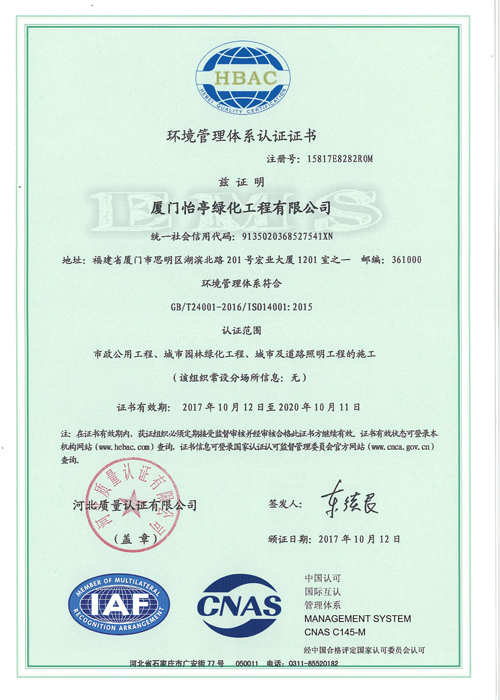 環(huán)境管理體系認證證書